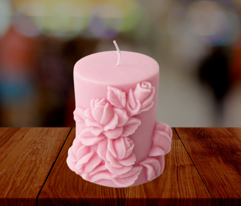 Una vela elegante y artesanal en forma de cilindro, decorada con una delicada corona de rosas 🌹