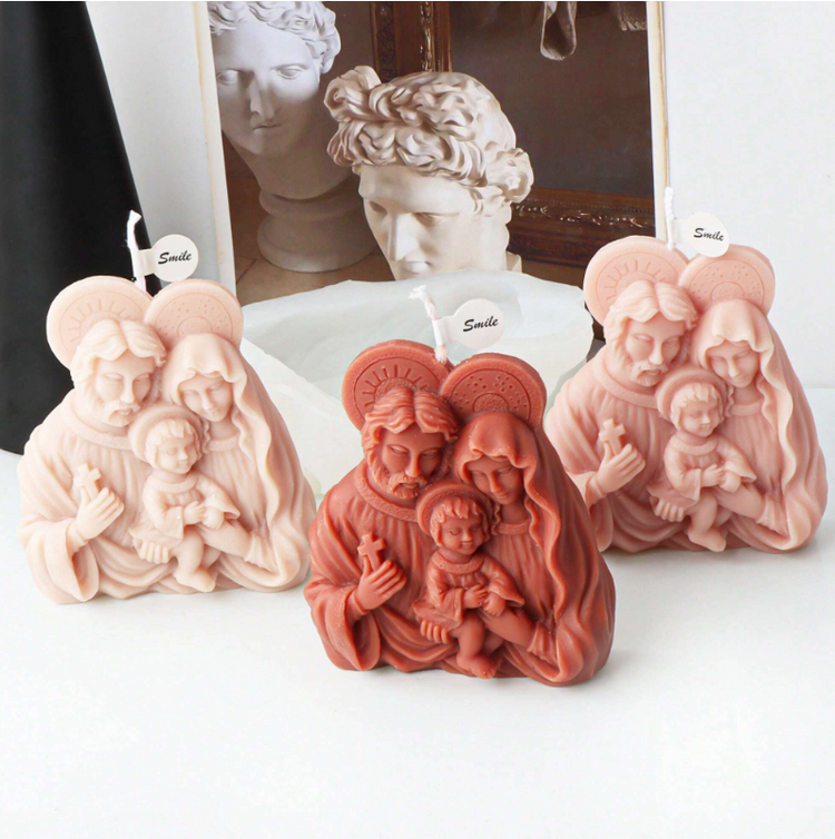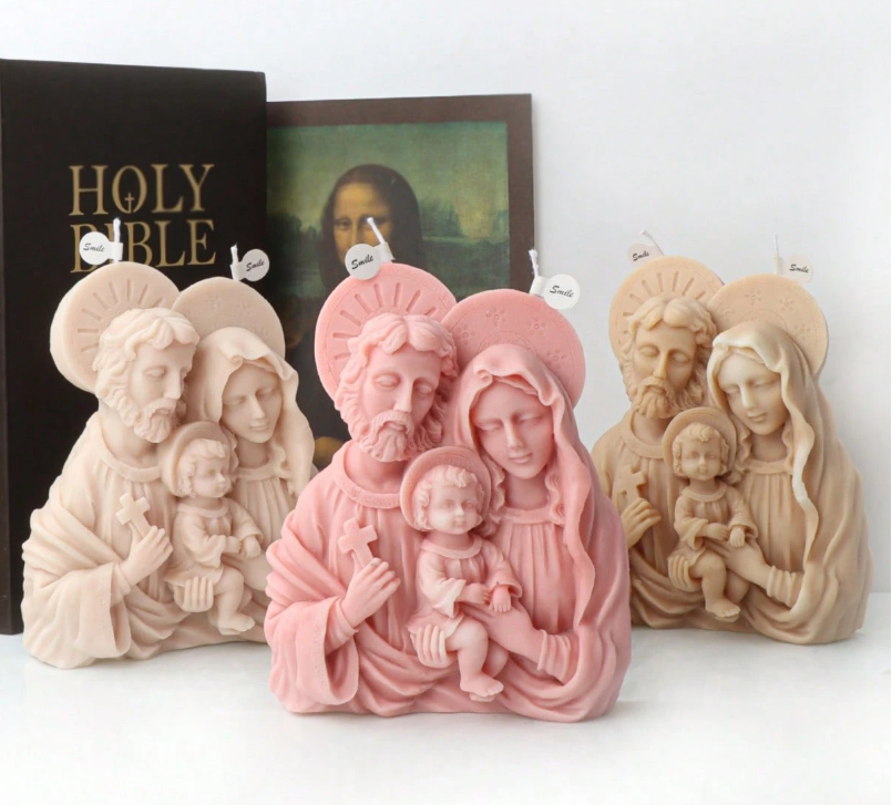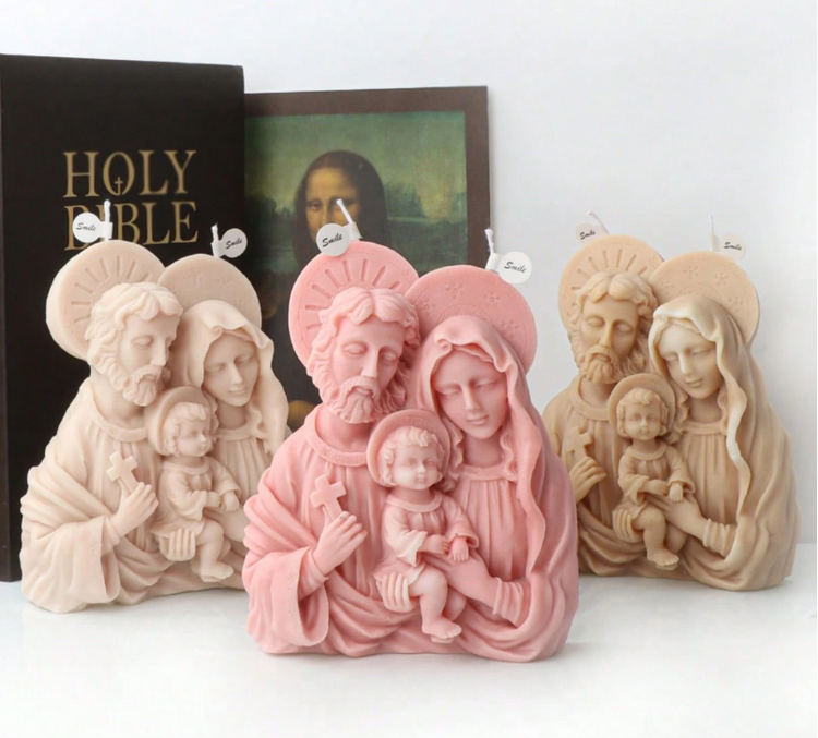 Vela religiosa de familia con niño y aureolas – 100% cera de soja, hecha a mano